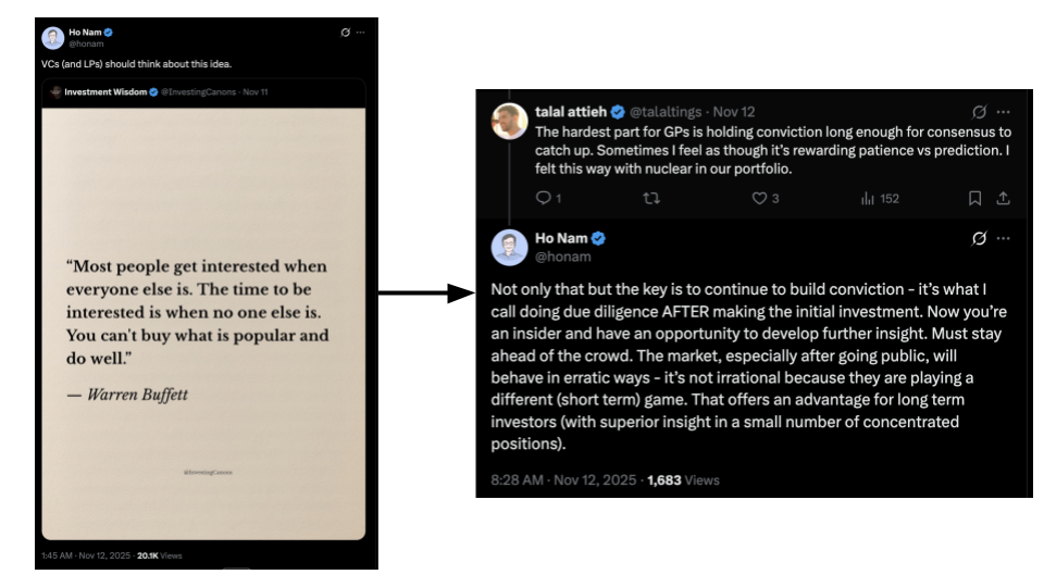 Importantly though, conviction is not static. The crowd is always chasing (or running away). As Ho Nam, the co-founder of Altos Ventures known for his ~$400M investment in Roblox that started out of $86M fund, said in an exchange with Talal on X, “... the key is to continue to build conviction - it's what I call doing due diligence AFTER making the initial investment.” At IPO, Altos owned ~24% of the now ~$70B Roblox.