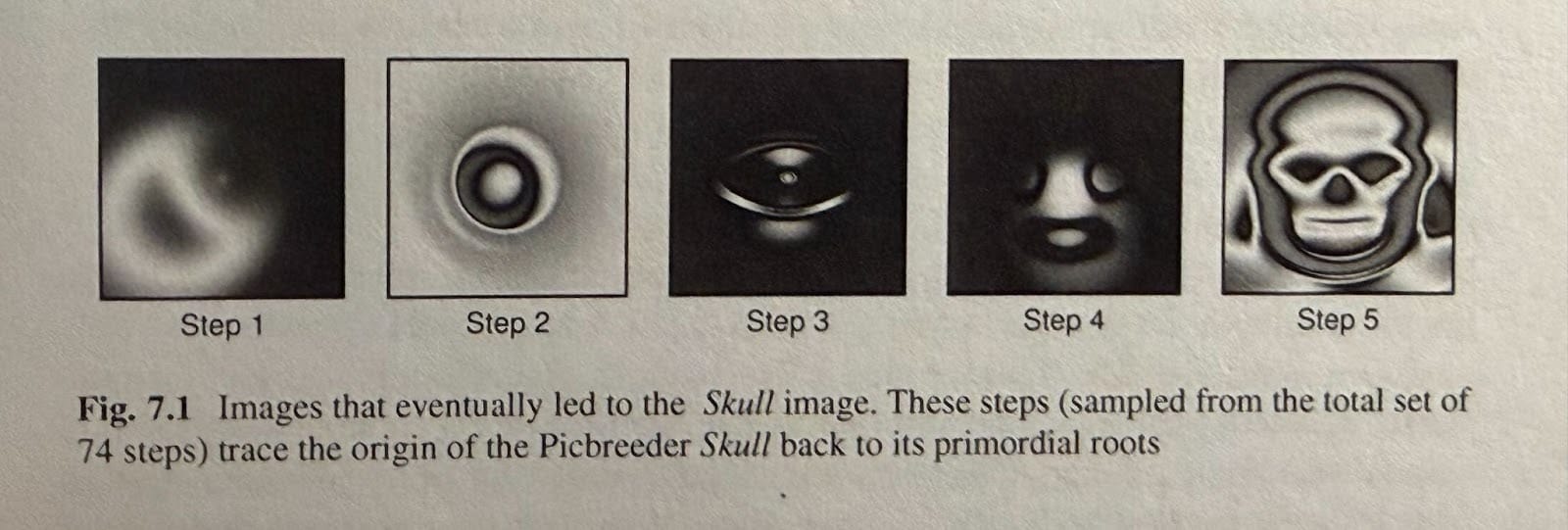 The above is an evolutionary lineage of a skull image discovered on Picbreeder. So what’s interesting about it? Early images just look like blobs. The middle ones maybe have some abstract patterns. Only right at the end of the evolution does it look anything like a skull. With that, the authors propose a thought experiment. Imagine a government program whose objective is “Evolve a skull image on Picbreeder.”