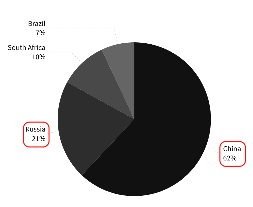 Due to the required concentration of vanadium in iron ore for profitable by-product extraction, Vanadium production is concentrated in 10 steel mills across China (62%) and Russia (21%) that account for the majority of global supply. This concentration in just 10 mills creates incredible volatility risk. This led the US Department of the Interior to declare vanadium one of 35 critical minerals – minerals that are integral to the US economy and security.